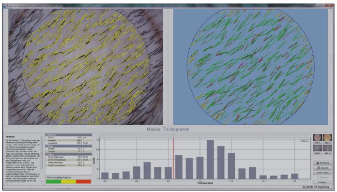 自動分析,可以分析出單位面積的毛發密度,終毛百分比,毳毛百分比,終毛/毳毛比例,毛發直徑以及生長期毛發與休止期毛發的比例,從而及時準確的分析出毛發生長狀態的變化,