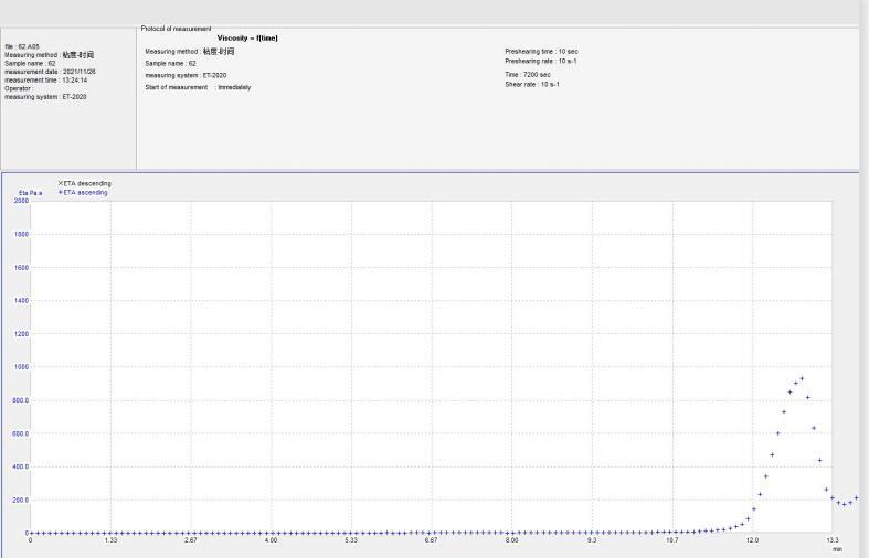 在一定溫度下,一定剪切速率下,從曲線可以看出,樹脂固化后粘度突變時間點